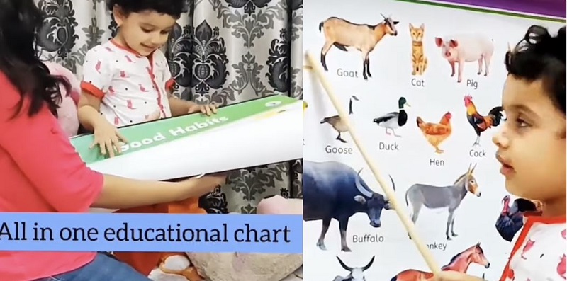 A pack of 7 charts are a great way for your children to learn English alphabets, names of fruits, vegetables, good habits, domestic and wild animals & bird names with colorful pictures! These charts are presented in a very attractive and unique format to instill curiosity in the minds of kids. They have lively and realistic images & are laminated.